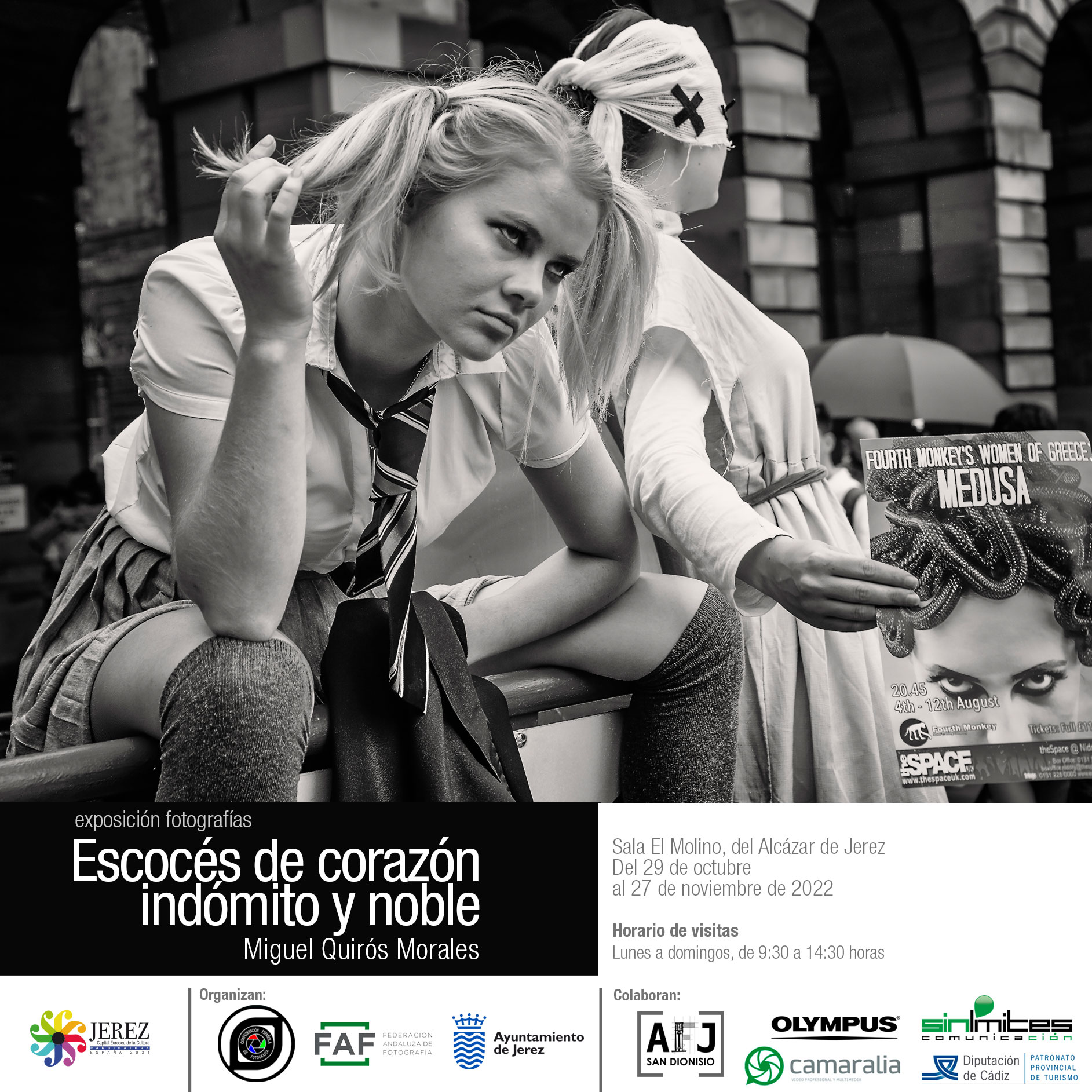 La exposición homenaje por parte de la Confederación Española de Fotografía a Miguel Quirós titulada “Escocés de corazón indómito y noble” se celebra del 29 de octubre al 27 de noviembre en horario de lunes a domingo de 09:30 a 14:30 en la sala El Molino del Alcázar de Jerez